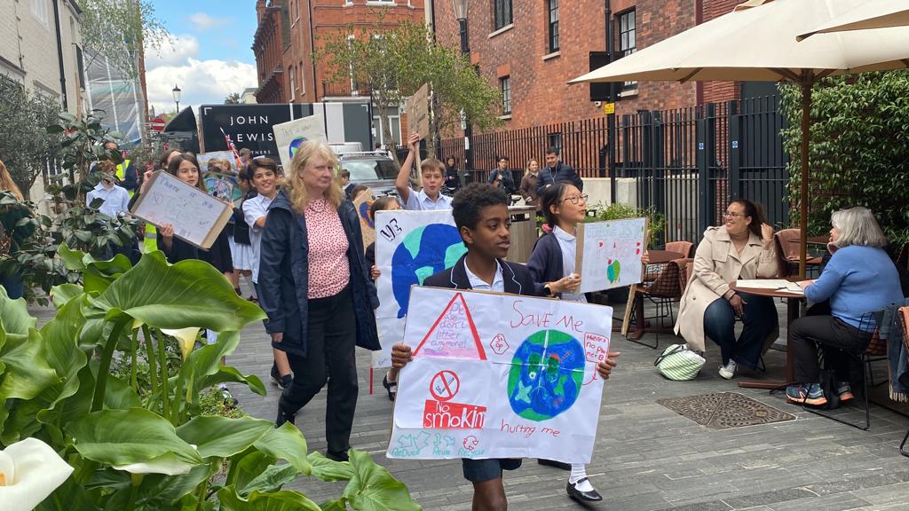 The pupils were joined on the day by award-winning naturalist, author and filmmaker Nick Gates and the SOS from the Kids choir, who have previously performed at COP26 and Britain’s Got Talent. The SOS choir sang for pupils at an all-school assembly in the morning which Nick Gates also spoke at. The choir and Gates then helped the Knightsbridge School (KS) pupils make banners and signs for their peaceful march through the community. The SOS Kids choir marched alongside KS pupils to Duke of York Square where all the children performed two songs together for the public.